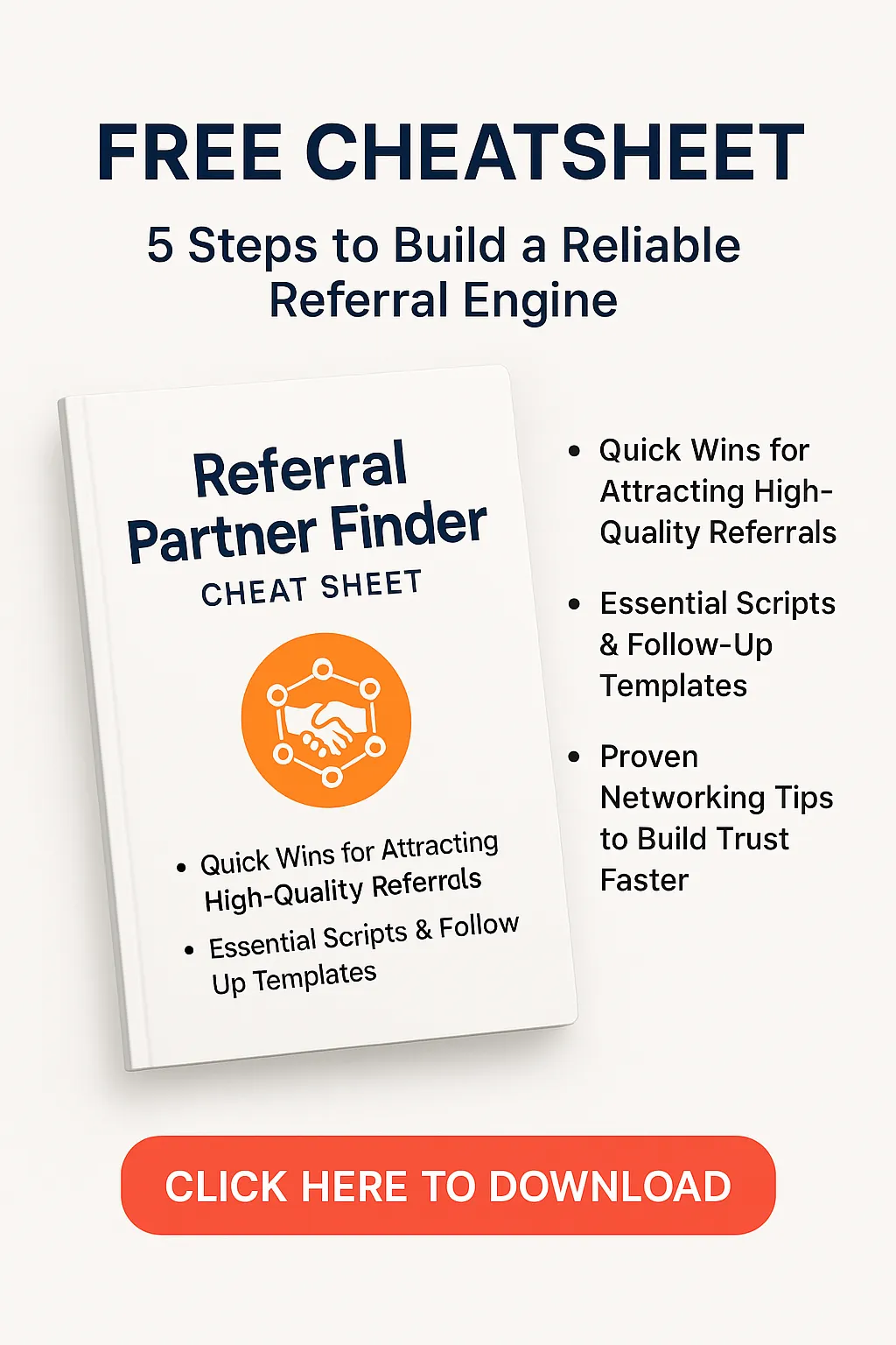 After having so many clients come to me feeling stuck, isolated, and overwhelmed trying to grow alone (and having made many of the same mistakes myself), I created this simple yet powerful Referral Partner Finder Cheat Sheet to help heart-led business owners grow through authentic relationships, not cold tactics.
